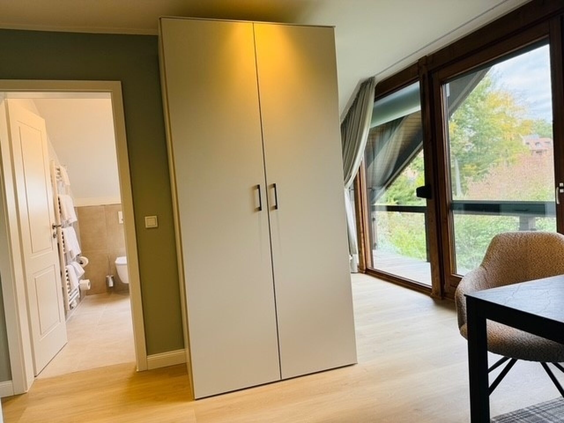 Das gemütliche Ein-Raum-Appartement ist 50 m² groß und befindet sich im Obergeschoss des Gästehauses. Es verfügt über ein Doppelbett für zwei Personen, eine einrichtete Küchenzeile, ein Bad mit Dusche und einen Balkon.