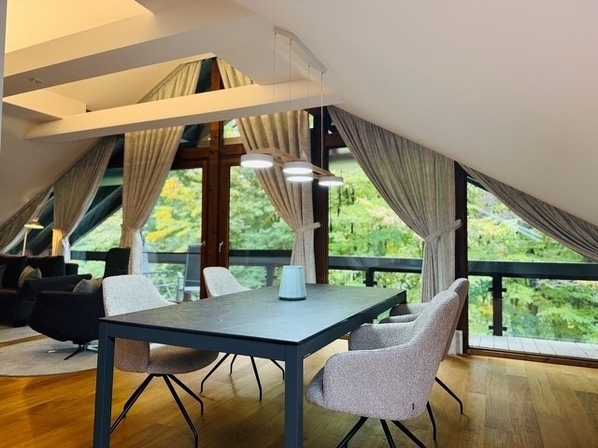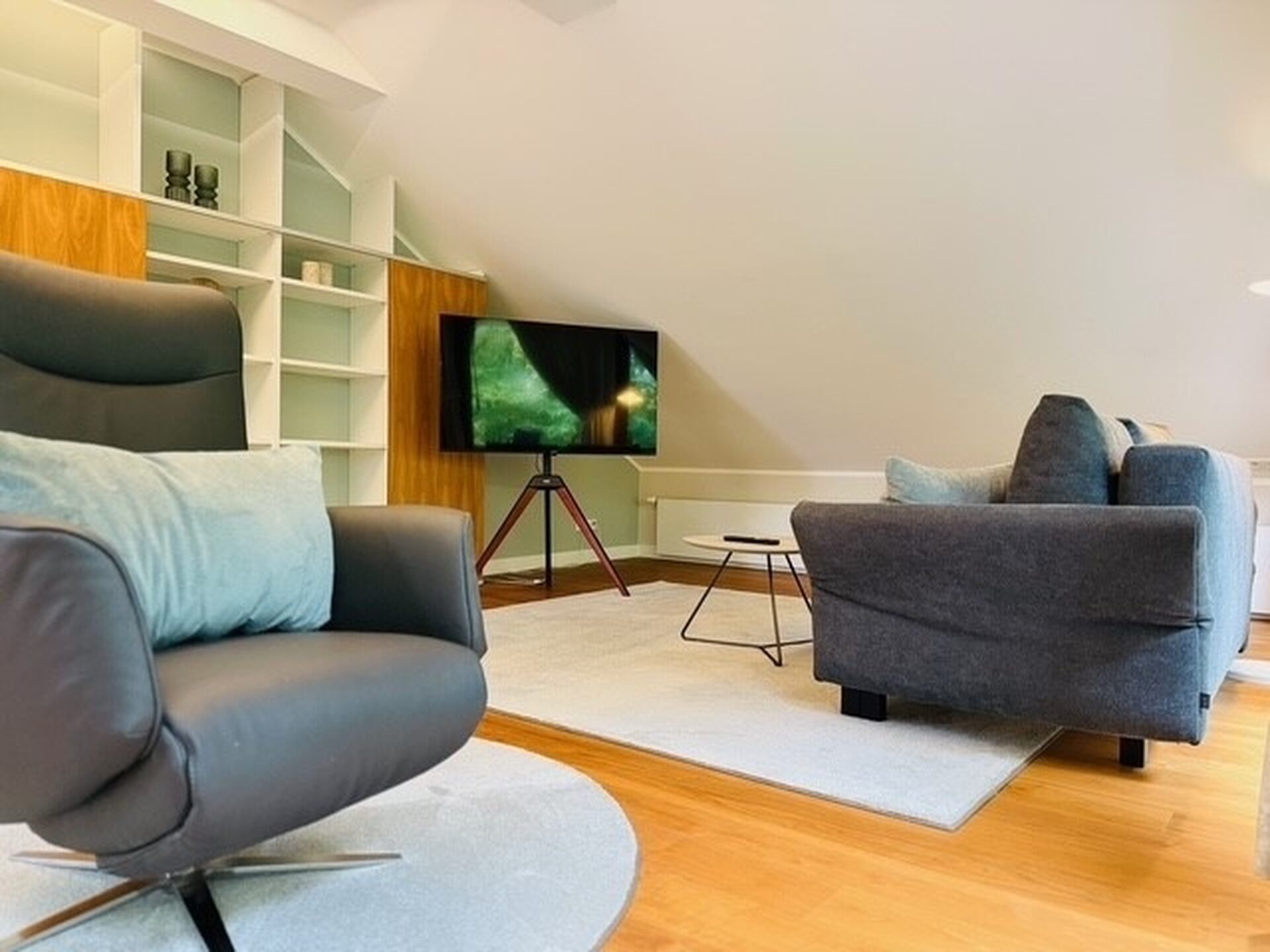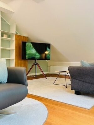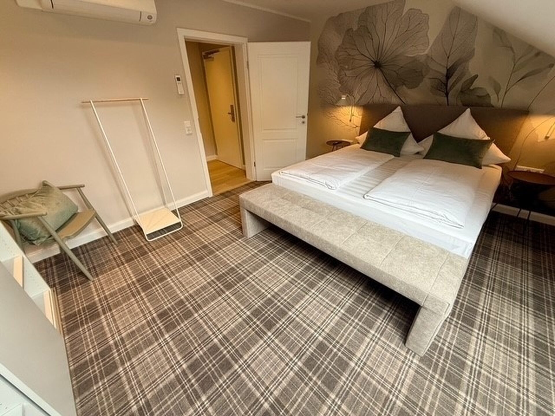 Das geräumige Appartement erstreckt sich auf 75 m² und befindet sich im Obergeschoss des Gästehauses. Bis zu 4 Personen können hier bequem wohnen. Im separaten Schlafzimmer befindet sich ein Doppelbett für zwei Personen und im Wohnraum eine Schlafcouch für 2 Personen. Die Küchenzeile ist voll ausgestattet, das Badezimmer verfügt über eine Dusche. Ein Balkon ist ebenfalls vorhabenden.